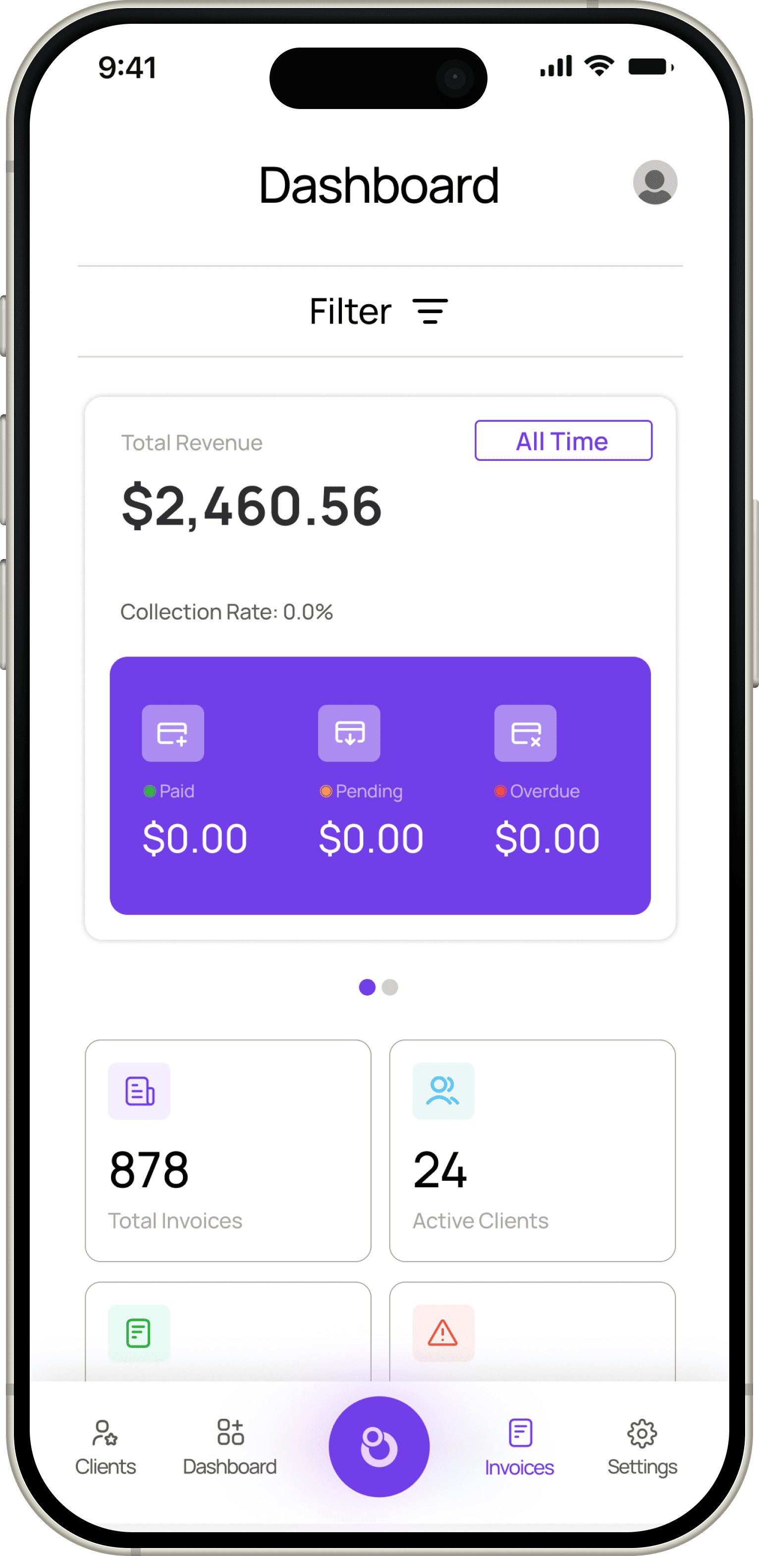 Experience a clear snapshot of your business at a glance. Our dashboard shows total invoices, overdue payments, active clients, collection rates, and more.